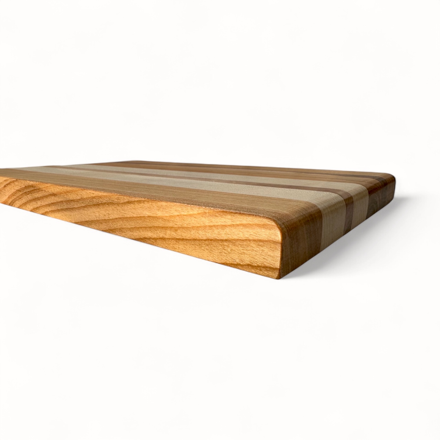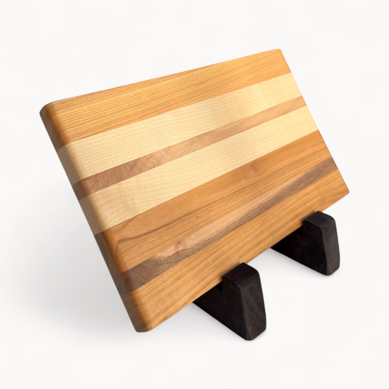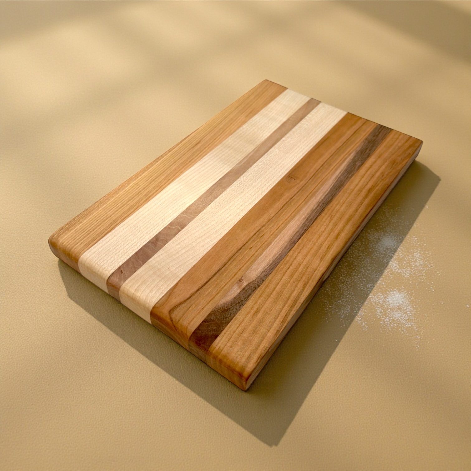 Un tocător edge-grain realizat manual din cireș, arțar și nuc autohton, cu un design curat și linii naturale inspirate din texturile fine ale nisipului.